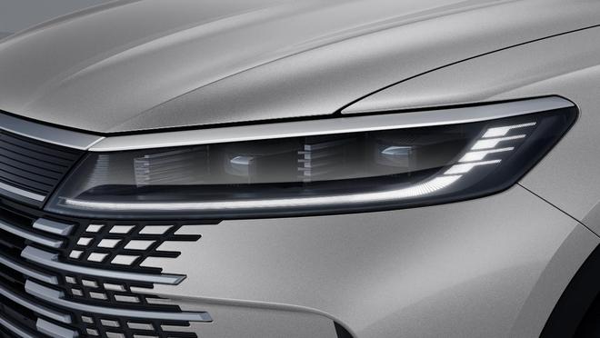 The front headlights feature a bold and clean design, consistent with the styling of the front end. The elements within the light housings echo the chrome accents of the grille, enhancing the vehicle's technological feel. The vertical lines of the LED light assembly contrast with the horizontal lines, showcasing meticulous attention to detail. The smoked light housing design further elevates the overall presence of the vehicle.