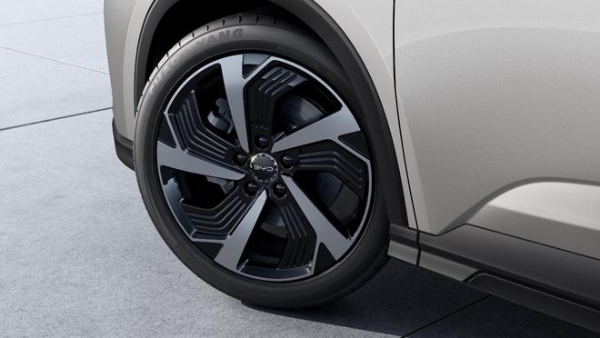 On the sides, the layered wave-like floating roof and silver metal trim add a touch of style. The body lines are full and smooth, with the waistline and skirt line flowing naturally. The wheel design is minimalist, with a striking contrast between black and silver metallic colors, creating a dynamic visual impact.